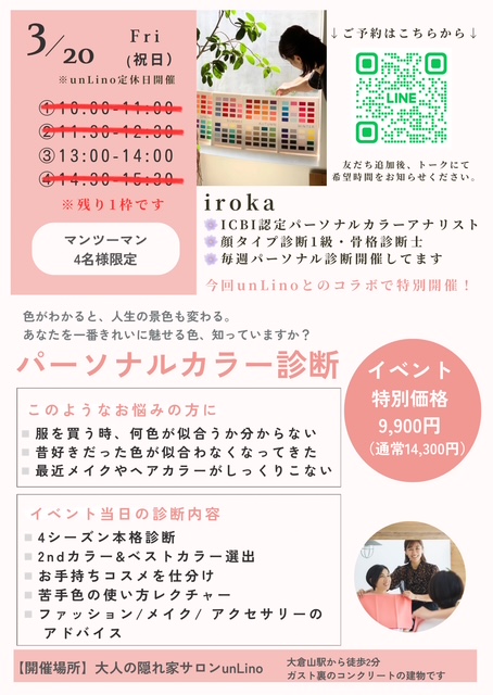 また、イベント日以外でもパーソナルカラー診断は随時開催しておりますので、